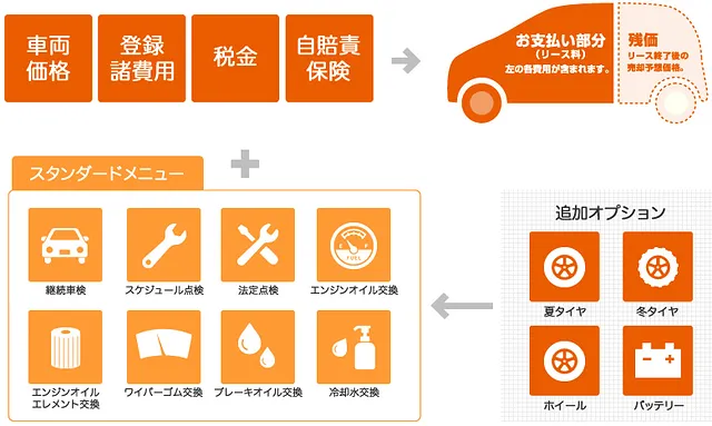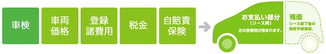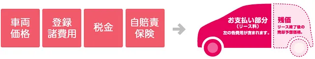 車両代、登録諸費用、自賠責保険、税金を合わせてリースでまかなう方法です。