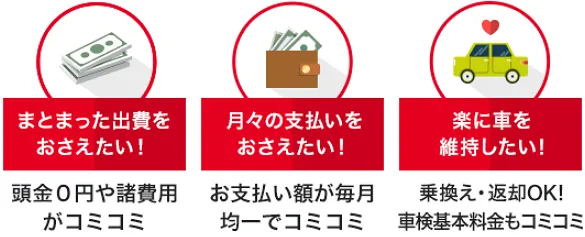 月々のお支払いはリーズナブルに抑えて、さらに諸費用コミコミでお支払いも毎月均一なので、手軽に新車にのれちゃいます。