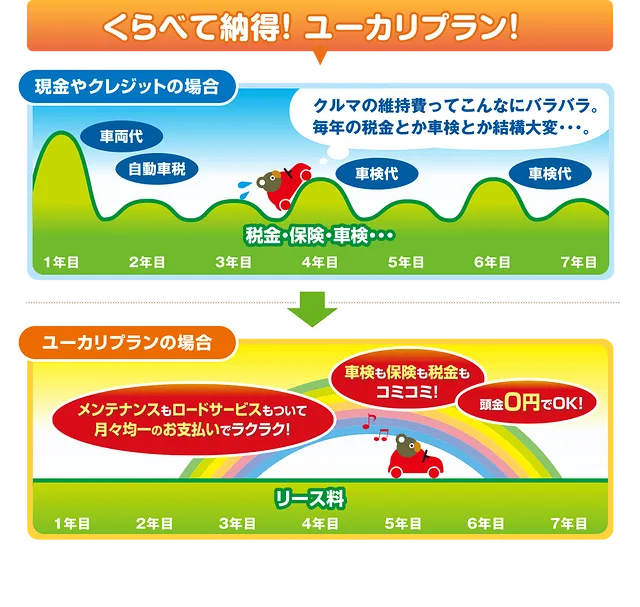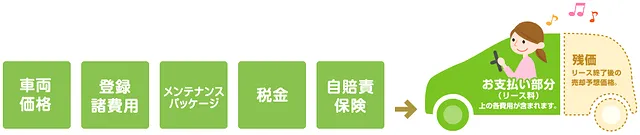 車両代、登録諸費用、自賠責保険、税金さらにメンテナンスサービスを含んだオートリースです。
