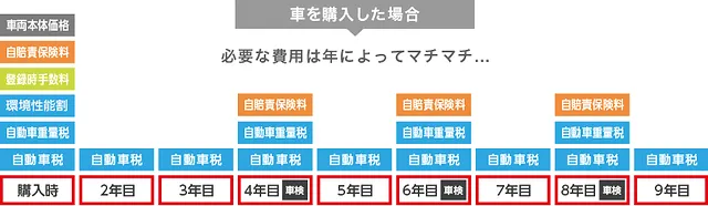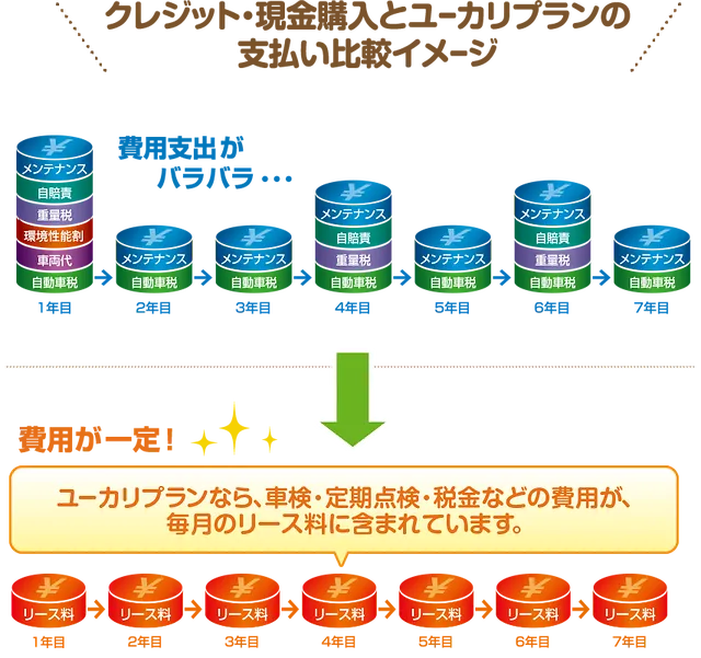 毎月のリース料に、点検や車検などのメンテナンス費用、自動車税、自賠責保険など、リース期間中に発生する費用が含まれますので、お支払額は毎月定額となります。